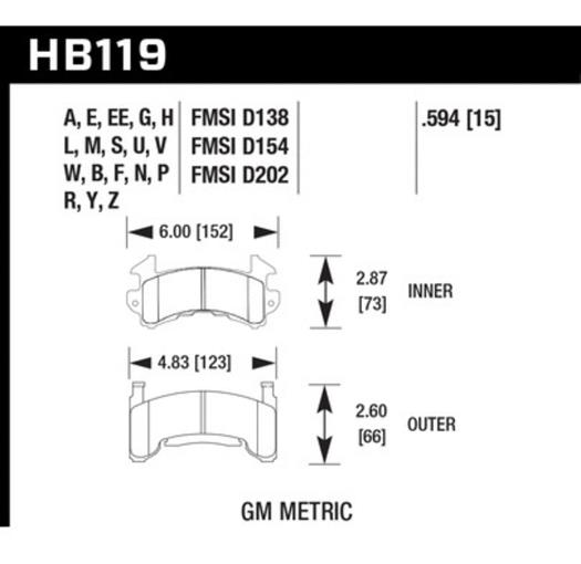 Brake Pads- DTC-50 Compound; High Torque, High Temperature; GM Metric Caliper; Set of 4 (Enough for two wheels). Thickness: 0.594in